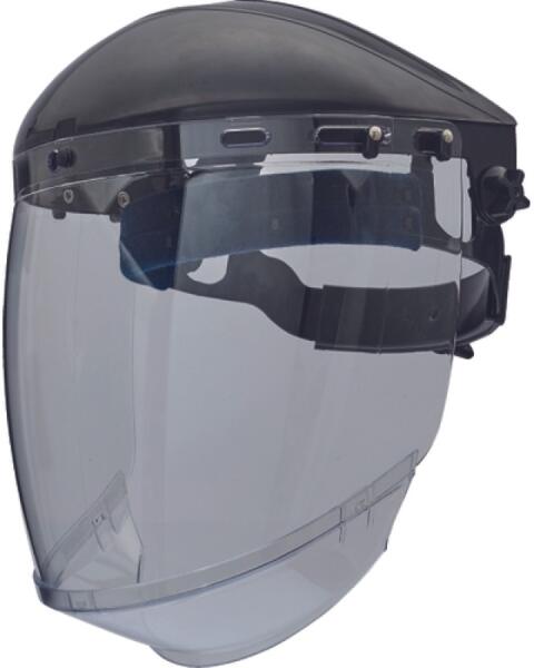 Víztiszta, 1AT osztályú polikarbonát arcvédő homlokvédővel, ABS fejrésszel, amely az áll környékén fokozott védelmet biztosít. Nagy energiájú, nagy sebességű részecskék, olvadt fém és forró szemcsék ellen véd. Súly: 380 g EN 166, EN 170