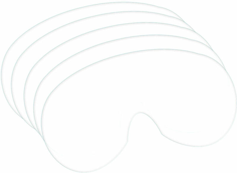 1 mm vastag, víztiszta polikarbonát kétoldali védőfóliával, ötpontos illeszkedés a homlok- (60700) és sisakpánthoz (60705, 60707, GAN65755), 60710: 430×195 mm látómező