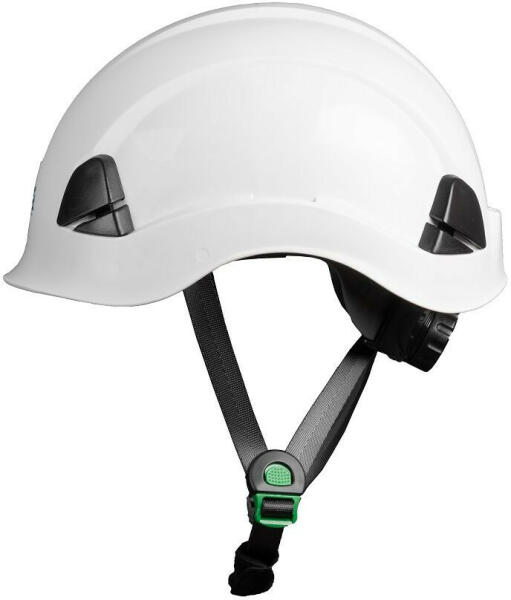 Többfunkciós, ABS alapanyagú fehér sisak, 1000V elleni védelemmel többfunkciós, ABS alapanyagú fehér sisak magasban végzendő, ipari vagy mentési, alpinista munkákhoz 1000 V váltakozó feszültségű villamos vezeték érintése elleni védelem gyorsbeállítós racsnis, 6 ponton felfüggesztett textil fejkosár (52-63 cm) 3 pontos Y állszíj biztonsági csattal a rövid sildnek kös