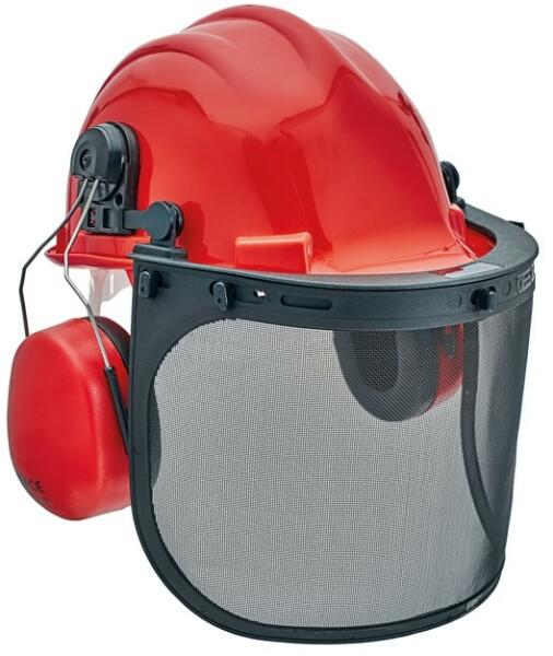Erdész készlet piros színű ABS sisakkal, hálós arcvédővel és piros színű fültokkal. A sisak csúszkás fejpánttal készül, 4 pontos PE fejkerettel.