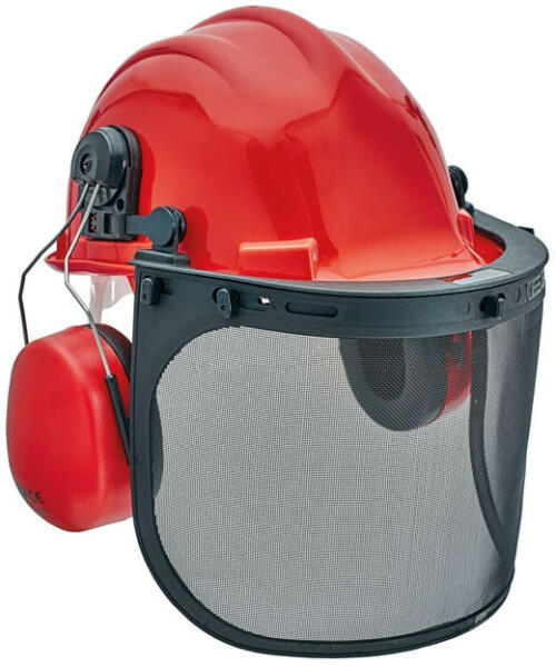 Alapanyag: Polietilén A termék megfelel az EN 397 szabványnak. Erdész készlet piros színű ABS sisakkal, hálós arcvédővel és piros színű fültokkal. A sisak csúszkás fejpánttal készül, 4 pontos PE fejkerettel.