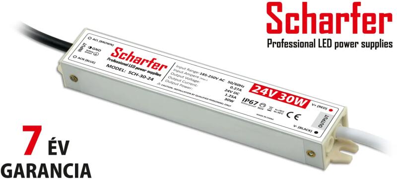 30W - átmenő teljesítmény. - védelemmel. AC 170-250V a bemeneti feszültség. Kimenete: DC 24V, 1,25A (egyenáram). Mérete: 162x29x21mm mm. Garancia: 7 év. A Scharfer egy fémházas, IP67-es védelemmel rendelkező igen megbízható 85%-os hatásfokú slim (vékony keskeny, hosszú) tápegység. Rövidzárlat, túlterhelés és túlfeszültség elleni védelemmel rendelkezik.