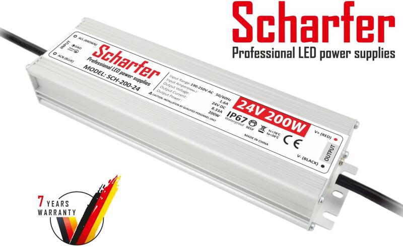 200W - átmenő teljesítmény. - védelemmel. AC 190-250V a bemeneti feszültség. Kimenete: DC 24V, 8,33A (egyenáram). Mérete: 225x65x35mm mm. Garancia: 7 év. Scharfer fémházas, IP67-es védelemmel rendelkező igen megbízható 89%-os hatásfokú 24 Voltos 200 Watt átmenő teljesítményt nyújtó tápegység. Rövidzárlat, túlterhelés és túlfeszültség elleni védelemmel rendelkezik