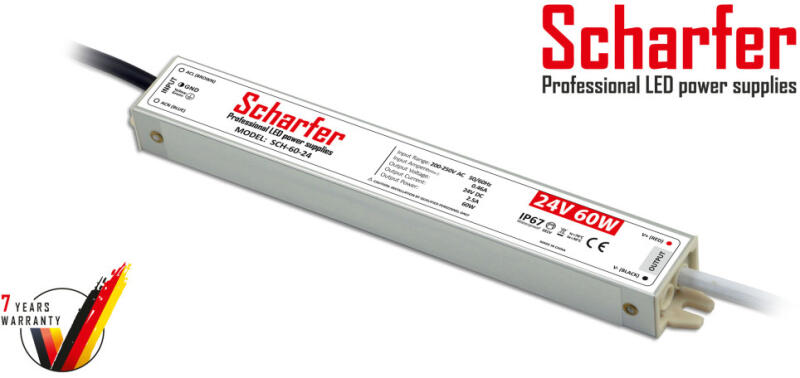 Scharfer 60 Wattos stabilizált, 24 Voltos LED tápegység - LED világításhoz A Scharfer alumínium-műanyag házas LED tápegység 24 Voltos LED szalagok , LED modulok kültéri és beltéri üzemeltetéséhez is használható. A tápegységeket rövidzárlat és túlfeszültség ellen is védelemmel is ellátták, a biztonságos használat érdekében. Továbbá IP67-es védelmi szint jellemz