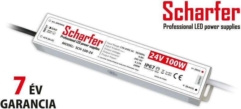 100W - átmenő teljesítmény. - védelemmel. AC 170-250V a bemeneti feszültség. Kimenete: DC 24V, 4,17A (egyenáram). Mérete: 218x40x22mm mm. Garancia: 7 év. A Scharfer egy fémházas, IP67-es védelemmel rendelkező igen megbízható 90%-os hatásfokú slim (vékony keskeny, hosszú) tápegység. Rövidzárlat, túlterhelés és túlfeszültség elleni védelemmel rendelkezik.