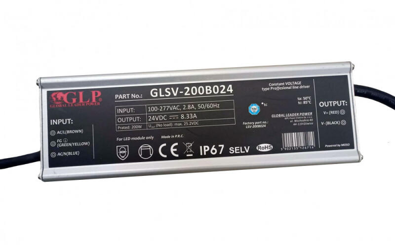 Tápegység LED alkalmazásokhoz Kimenet: 24V DC Teljesítmény: 200W Bemeneti feszültség: 100-277VAC IP: 67 Védelem: rövidzárlat, túlfeszültség, túlmelegedés Méretek (H x SZ x M): 211 x 67 x 44 mm Garancia: 5 év