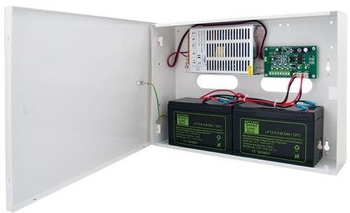 Falra szerelhető, Zárható fémdobozos, Szünetmentes tápegység, 12 V DC, 4 x 1 A, 4 X 12 W, 4 pár kimeneti sorkapocs, 2 db akkumulátor csatlakozó, Fehér