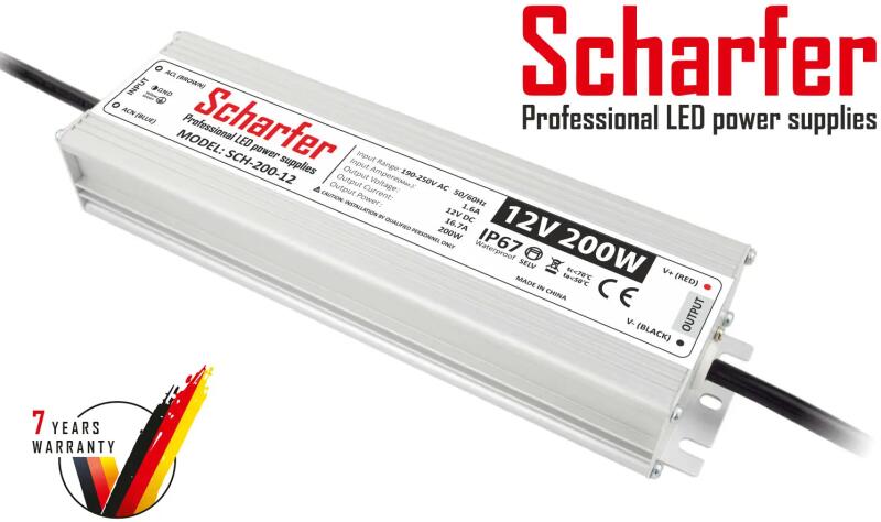 200W - átmenő teljesítmény. - védelemmel. AC 190-250V a bemeneti feszültség. Kimenete: DC 12V, 16,7A (egyenáram). Mérete: 225x65x35mm mm. Garancia: 7 év. Scharfer fémházas, IP67-es védelemmel rendelkező igen megbízható 89%-os hatásfokú 12 Voltos 200 Watt átmenő teljesítményt nyújtó tápegység. Rövidzárlat, túlterhelés és túlfeszültség elleni védelemmel rendelkezik