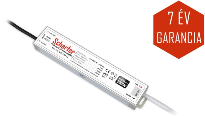 100W - átmenő teljesítmény. - védelemmel. AC 170-250V a bemeneti feszültség. Kimenete: DC 12V, 8.33A (egyenáram). Mérete: 218x40x22mm mm. Garancia: 7 év. A Scharfer egy fémházas, IP67-es védelemmel rendelkező igen megbízható 90%-os hatásfokú slim (vékony keskeny, hosszú) tápegység. Rövidzárlat, túlterhelés és túlfeszültség elleni védelemmel rendelkezik.