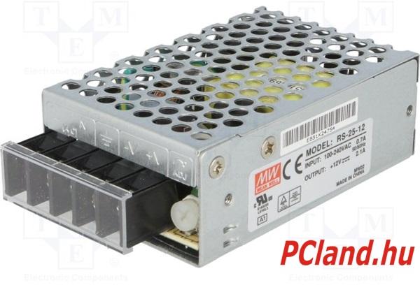 A Mean Well RS-25-12 egy kisméretű egy kimenetes tápegység, mely a szabad levegőáramlás segítségével hűti magát.
