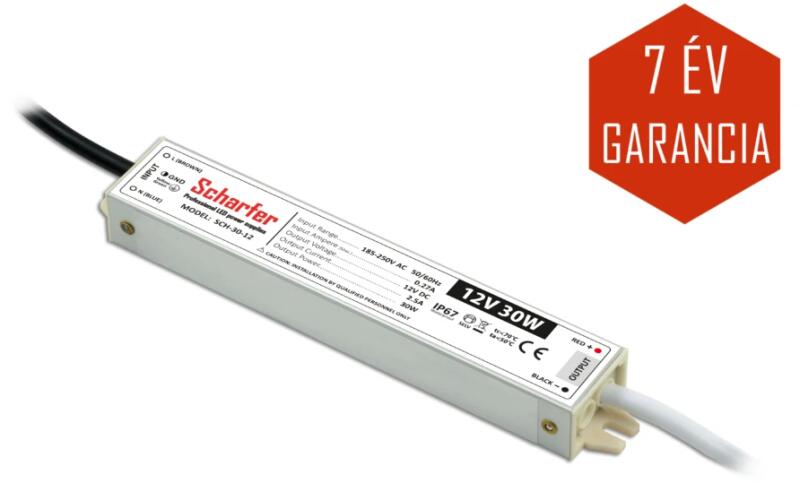 30W - átmenő teljesítmény. - védelemmel. AC 170-250V a bemeneti feszültség. Kimenete: DC 12V, 2.5A (egyenáram). Mérete: 162x29x21mm mm. Garancia: 7 év. A Scharfer egy fémházas, IP67-es védelemmel rendelkező igen megbízható 85%-os hatásfokú slim (vékony keskeny, hosszú) tápegység. Rövidzárlat, túlterhelés és túlfeszültség elleni védelemmel rendelkezik.