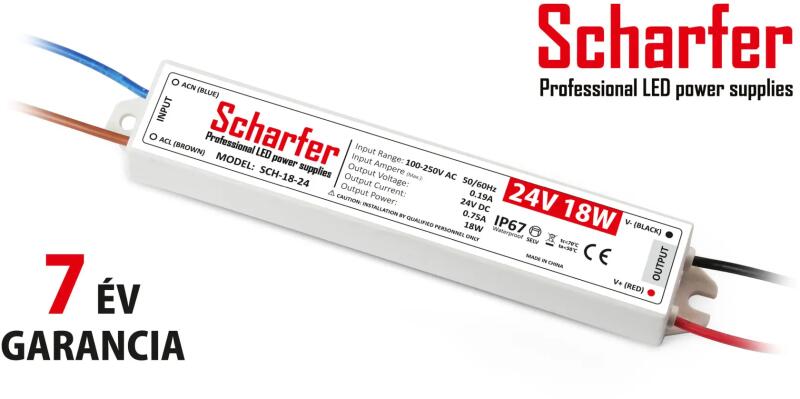 18W - átmenő teljesítmény. - védelemmel. AC 170-250V a bemeneti feszültség. Kimenete: DC 24V, 0,75A (egyenáram). Mérete: 162x28x20mm mm. Garancia: 7 év. Ez a Scharfer egy ABS (műanyag) házas, IP67-es védelemmel, V0 tűzállósággal rendelkező igen megbízható 83%-os hatásfokú slim (vékony keskeny, hosszú) tápegység. Rövidzárlat, túlterhelés és túlfeszültség elleni vé