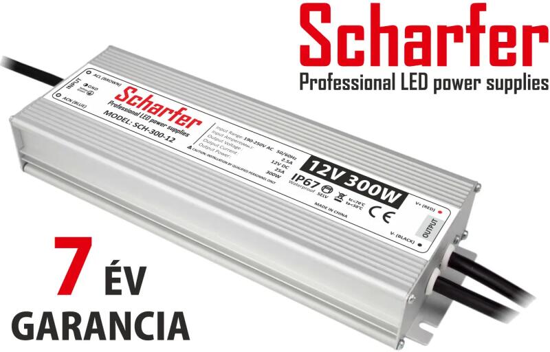 300W - átmenő teljesítmény. - védelemmel. AC 190-250V a bemeneti feszültség. Kimenete: DC 12V, 25A (egyenáram). Mérete: 257x90x40mm mm. Garancia: 7 év. A Scharfer egy fémházas, IP67-es védelemmel rendelkező igen megbízható 89%-os hatásfokú tápegység. Rövidzárlat, túlterhelés és túlfeszültség elleni védelemmel rendelkezik.