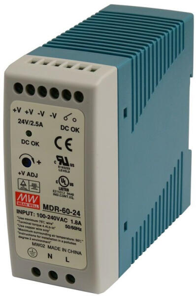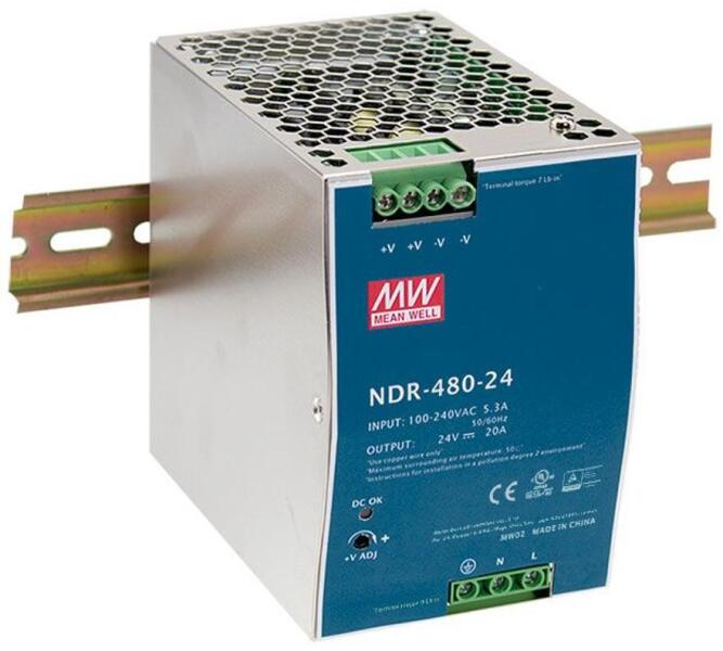 MEAN WELL NDR-480-24 DIN sínre szerelhető kapcsolóüzemű tápegység. Keskeny kialakításának köszönhetően helymegtakarítás érhető el az elosztószekrényben. Túlterhelés esetén állandó áramú kimeneti karakterisztika, ezáltal induktív és kapacitív fogyasztók megtáplálására is alkalmazható. 24V 20A-es kimenet Mindössze 85,5mm szélesség Rövidzárlat, túlterhelés,