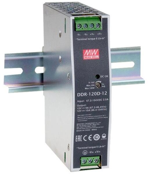 MEAN WELL DDR-120A-24 DIN sínre szerelhetőDC-DC konverter . Keskeny kialakításának köszönhetően helymegtakarítás érhető el az elosztószekrényben. 24V 4,2A-es kimenet Teljesítmény: 100.8W 150%-os csúcsterhelési képesség Mindössze 32mm szélesség Bemeneti feszültség tartomány:9... 18Vdc Állítható kimeneti feszültség24... 28V Magas 88,5% hatásfok Széles üzemi hőmérs