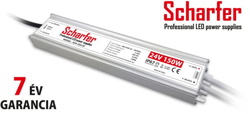 150W - átmenő teljesítmény. - védelemmel. AC 170-250V a bemeneti feszültség. Kimenete: DC 24V, 6,25A (egyenáram). Mérete: 279x57x25mm mm. Garancia: 7 év. A Scharfer egy fémházas, IP67-es védelemmel rendelkező igen megbízható 87%-os hatásfokú slim (vékony keskeny, hosszú) tápegység. Rövidzárlat, túlterhelés és túlfeszültség elleni védelemmel rendelkezik.