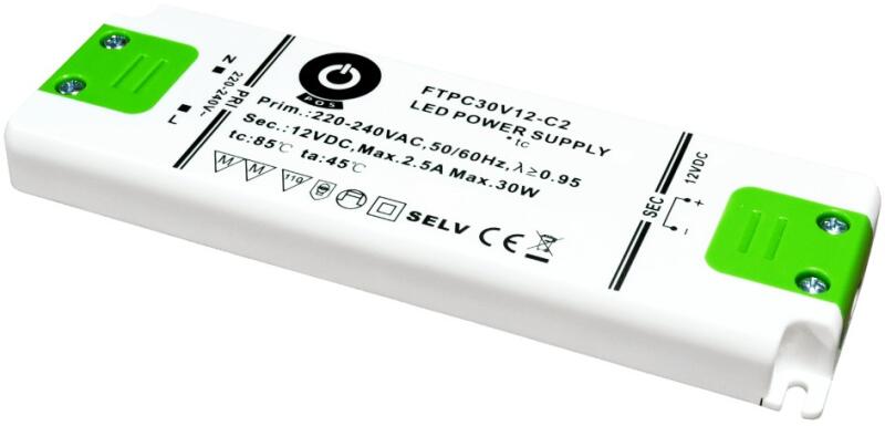 Tápegység LED alkalmazásokhoz, FTPC30V12-C2 Teljesítmény: 30 W Kimenet: 12V, 2,5 A λ > 0.95 No Load Power (max. ) 0.5W Szigetelési osztály: class II Üzemi hőmérséklet: -20 ~ +45 °C Védelem: rövidzárlat Méretek (H x SZ x M): 154 × 50 × 15 mm Garancia: 2 év