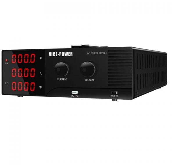 Nice-Power SPS3010 laboratóriumi tápegység tiszta LED-kijelzővel. Kimeneti áram: 0-10A, durva + finomszabályozás. Kimeneti feszültség: 0-30V, durva + finomszabályozás. Bemeneti feszültség: 230 V. A LED kijelző a feszültséget (V), az elektromos áramot (A) és az energiafogyasztást (W) mutatja. Kijelző felbontása: 00,01 (V), 0,001 (A). A megjelenítési pontosság ± 0,5% + 3 sz