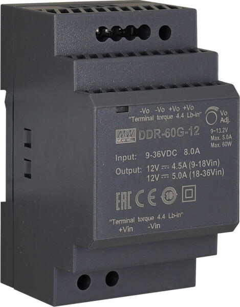 DIN sínre szerelhető, DC/DC konverter, 12 V DC, 5 A, 60 W, 2 pár kimeneti sorkapocs