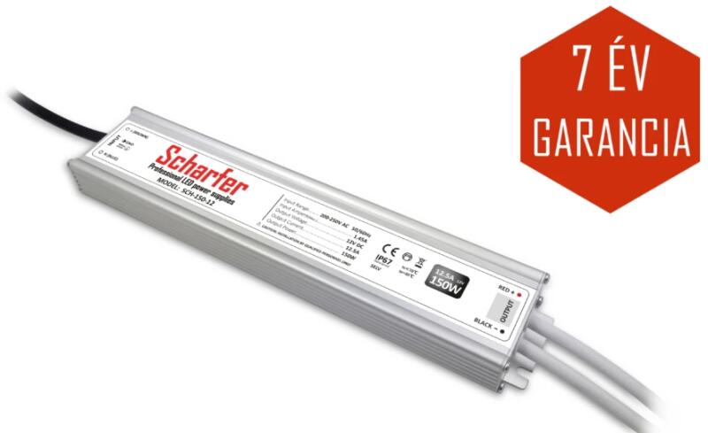150W - átmenő teljesítmény. - védelemmel. AC 170-250V a bemeneti feszültség. Kimenete: DC 12V, 12,5A (egyenáram). Mérete: 279x57x25mm mm. Garancia: 7 év. A Scharfer egy fémházas, IP67-es védelemmel rendelkező igen megbízható 87%-os hatásfokú slim (vékony keskeny, hosszú) tápegység. Rövidzárlat, túlterhelés és túlfeszültség elleni védelemmel rendelkezik.