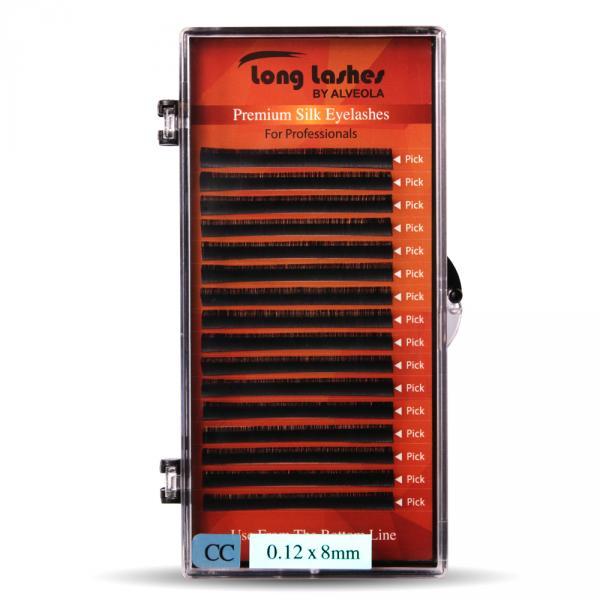 CC íveltségű, 0.12mm vastagságú, 8mm hosszúságú selyem szempilla 16 sorban. Prémium minőségű szempillák, melyek véghatása selyemfényű. Könnyített súlya miatt Duplázó, illetve Klasszik (1D) technikához ajánlott. Egy tálcán belül egy méretezés.