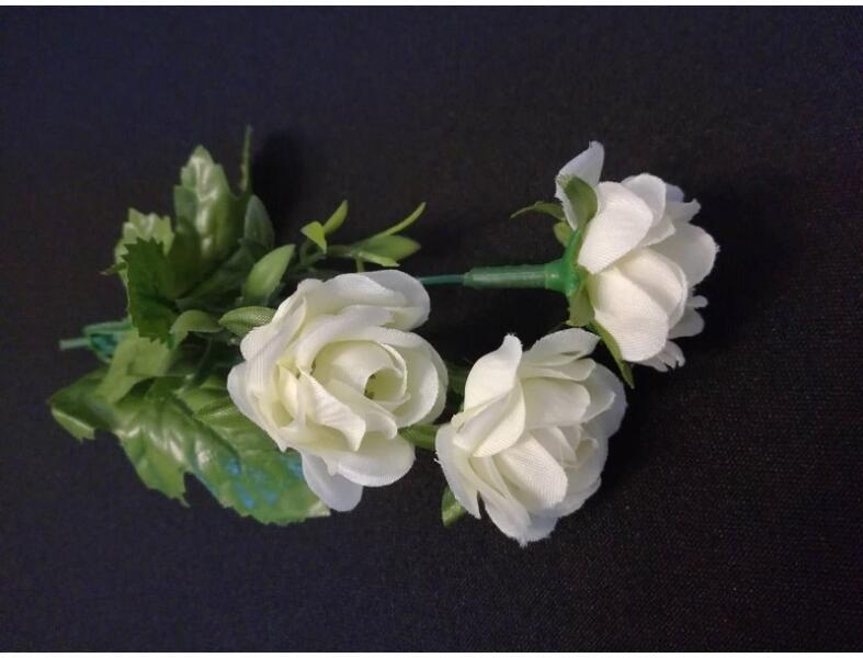 Törtfehér színű mini rózsacsokor, műnövény. Lakások dekorálására, asztali kiegészítőnek, esküvői, ballagási, születésnapi, keresztelői és egyéb dekorációkhoz. Méret: 15 cm
