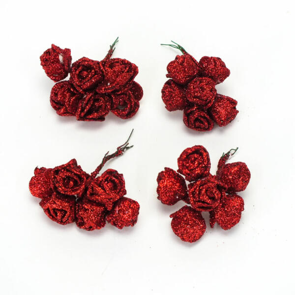 4x6 darabos csillámos rózsafej csokor. Tökéletes díszítő karácsonyi dekorációkhoz, egyedi készítményekhez és kreatív alkotásokhoz. Vékony fém szára lehetővé teszi a könnyű felhasználást. Teljes méret: 8cm, virágfej méret: 2cm
