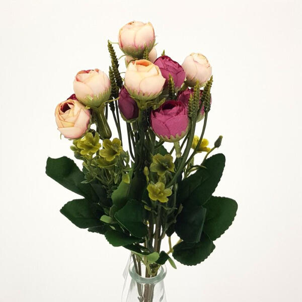 Az V397-es cikkszámmal ellátott cirmos mályva színű csokor egy kb. 33 cm hosszú selyemvirág kompozíció, mely tökéletes otthoni dekorációként szolgál. A virágcsokor kiváló minőségű anyagokból készült, így hosszú ideig megőrzi szépségét és frissességét. A lágy cirmos mályva és zöld szín elegáns hangulatot teremt és bármely helyiségben jól mutat.
