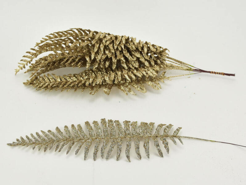 Csillámos páfrány levelek otthoni vagy kirakati díszítéshez. Hosszú, keskeny ágakkal látványos eleme a dekorációnak. Méret : hossz: 50cm, szél: 10cm