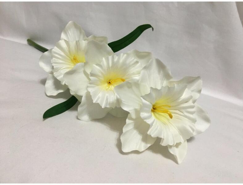 3 fejes, fehér színű nárcisz szál, műnövény, nagy méretű fejekkel. Hossza: kb. 50 cm. Virágfejek mérete: 12 cm. Lakások dekorálására, asztali kiegészítőnek, tavaszi, nyári, esküvői, ballagási, születésnapi, keresztelői, bármely egyéb dekoráció készítéséhez, vagy "csak" egyszerűen vázákba.