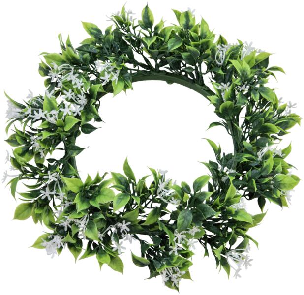 Jasmine wreath for theme decorations The artificial jasmine wreath of Europalms has a diameter of about 30 cm. Its green foliage and the decorative white flowers are completely made of PE and are therefore also well suited for outdoor use. As a door wreath it welcomes your visitors and customers or as a representative decorative element it gives your balcony, terrace or living rooms an appealing s