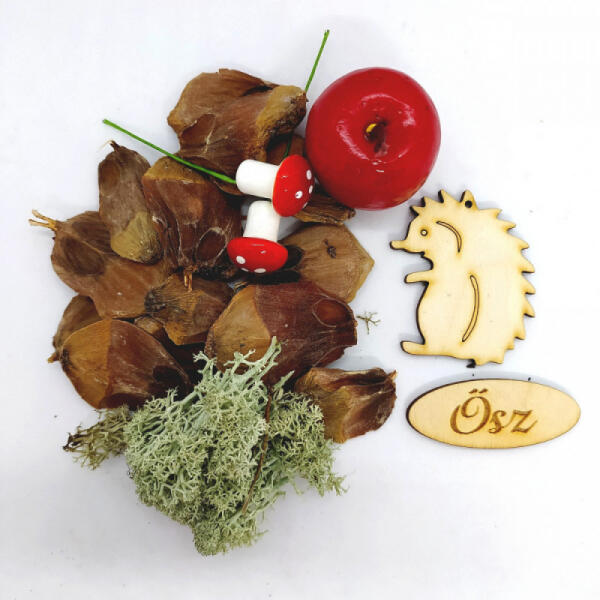 A csomag mindenből pont annyit tartalmaz, amire egy adott alkalommal szükség lehet. Ajtó- vagy asztaldíszt, őszi dekorációt készíthetünk el a hozzávalókkal. A csomag tartalma: 2 db piros gomba pick 1,5cm 1 db piros alma 1 db "Ősz" táblácska 5*2cm 1 db Süni 5cm Menta színű zuzmó 4 db barna csavart termés 10 db óriás toboz pikkely