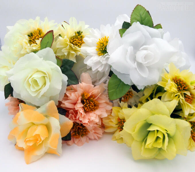 Selyem vegyes csokor 4 nagy rózsafej és 3 dáliafej. 4 színben