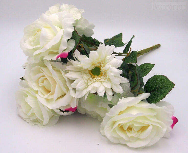 Selyem vegyes csokor 4 rózsával 3gerberával és 3 hortenziával. 6 színben