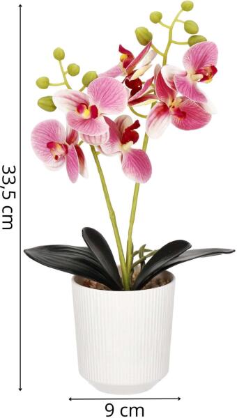 Alapvető adatok: Márka: Springos®Színek: zöld, fehérSzár és levél színe: zöldVirág színe: rózsaszín, fehérCserép színe: fehérTípus: mesterséges orchideaRózsaszín virágok száma: 7Levelek száma: 4Szárak száma: 2További információk: mesterséges levelek, ágak, cserép, kavicsok a virágokhoz rögzítve. Méretek:Magassága: 9,8 cmA cserép átmérője: 9 cmA virágcser