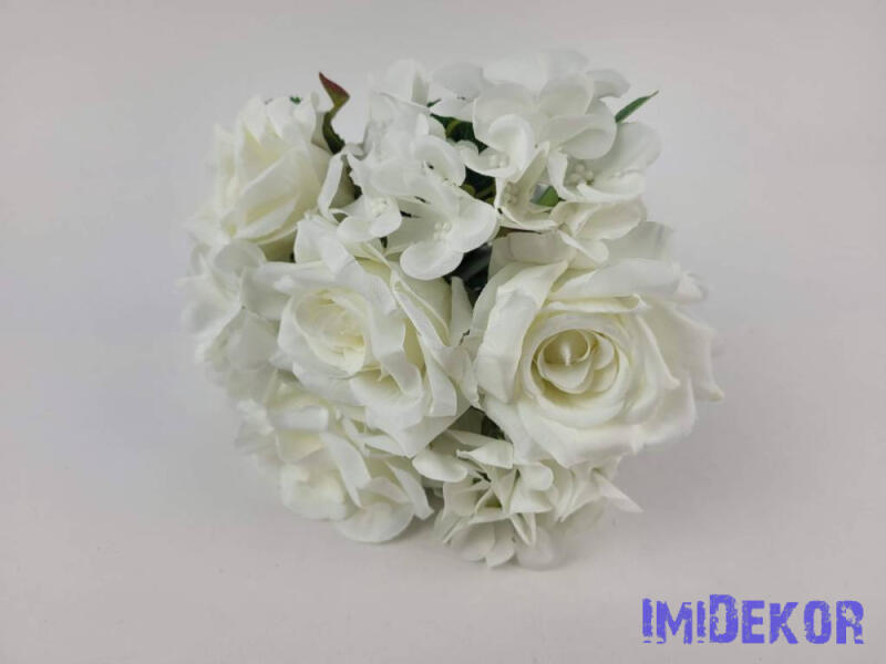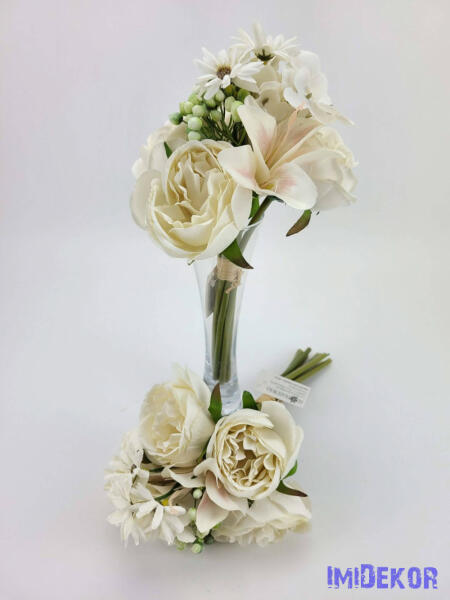 Ranunculus, liliom, hortenzia és kis virágok, dúsító zöldek csokra 8 szálas kötegelt kivitelben 28 cm magasságban