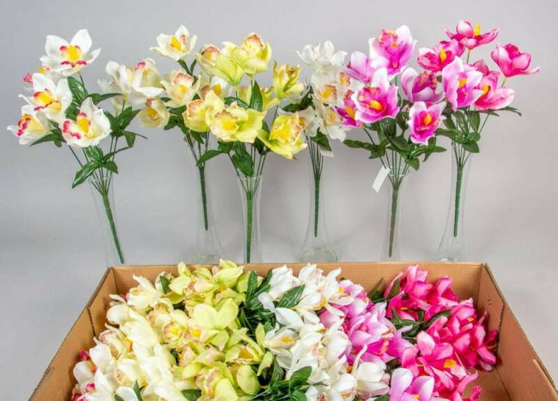 A csokrok csak művirágokat(selyem, mű, gumi, hab) tartalmaznak.