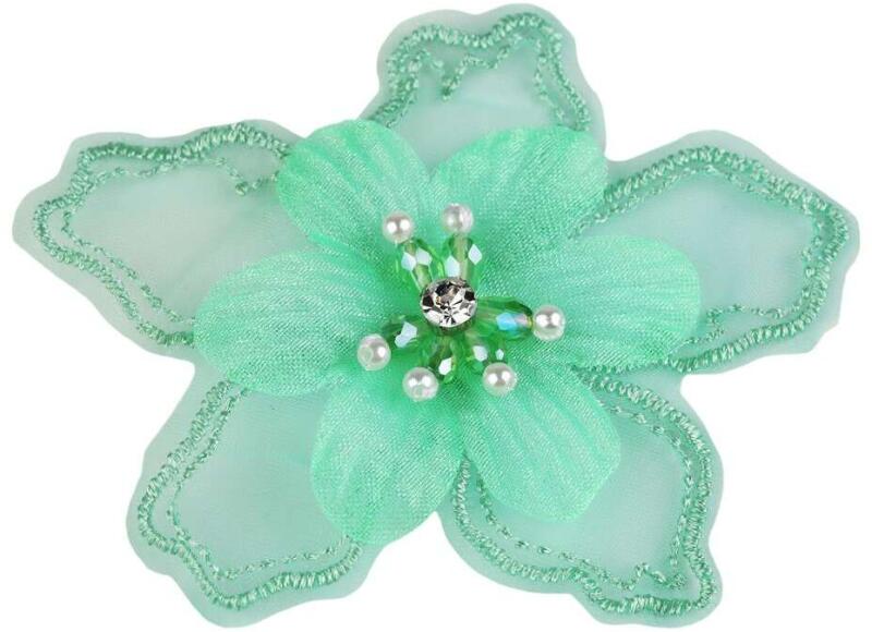 Gyöngyös textilvirág ruhák díszítésére, átmérő 8 cm, pasztellzöldA dekoratív virág 2 rétegből áll: a virág alsó része monofil, megerősített hímzett élekkel és nagyon romantikusnak tűnik. A második réteg egy egyszerű organza virágból áll. A virág közepét varrott vágott gyöngyök, gyöngyök és strasszok díszítik. Használ: A virágot varrhatja vagy ragaszthat