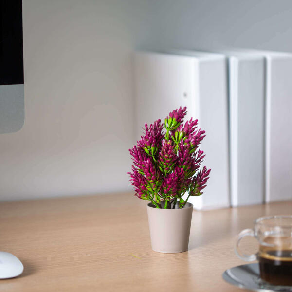 Lila babérmeggy csokor, műnövény. Lakások, rendezvények (esküvők, ballagások, stb... ) dekorálásra és asztali kiegészítőnek. Méret: 27 cm magas