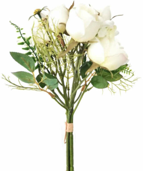 Művirágcsokor Szín: fehér, zöld Méret: 20.32 x 35.56 cm Anyagösszetétel: műanyag, fém, poliészter A csokor 3 fajta virágból áll.