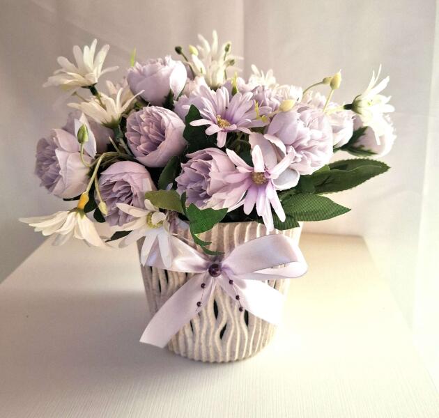 Szeretettel ajánlom figyelmedbe, ezt a szép jó minőségű, egyszerű színvilágú műanyag virágboxot. Ajánlom dekorációnak illetve ajándékba. A kaspót selyemvirágok hozzáadásával virágkötéssel és ragasztással ötvözve készítettem el. A virágos kaspó méretei: 23széles és 25cm magas ( virággal)