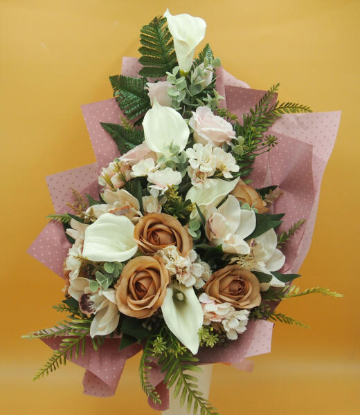 A csokrok csak művirágokat(selyem, mű, gumi, hab) tartalmaznak.