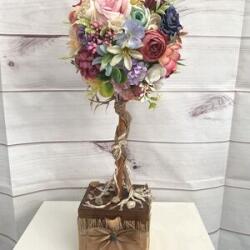 Szeretettel ajánlom figyelmedbe a fenti egyszerű, de annál mutatósabb asztali, ablak dekorációt. Fa és fonal színes virágok valamint dekorációs anyag felhasználásával készült. Megrendelésre készülhet a kívánt színben és méretben, egyeztetés után. Remélem megnyeri tetszésedet. Mérete 45 cm magas