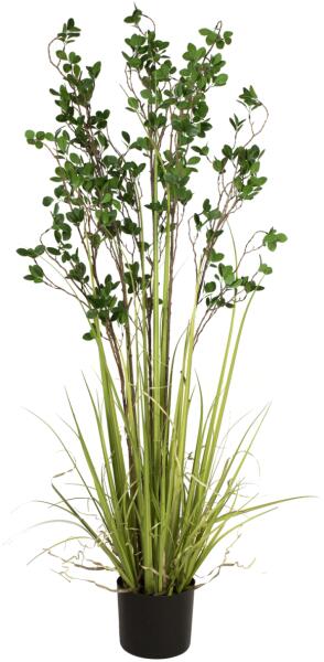 Evergreen arrangement in decorative pot Set targeted green accents with the artificial evergreen shrub from Europalms. In the twinkling of an eye, you can create a pleasant atmosphere even in simply furnished office and living rooms. The branches of the evergreen spindle shrub protrude from a light green grass bush, whose PE leaves, graduated in length, already fall into shape by themselves when p