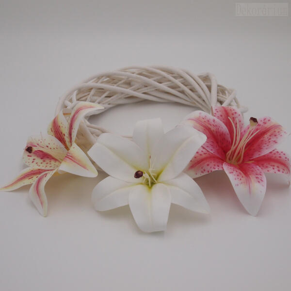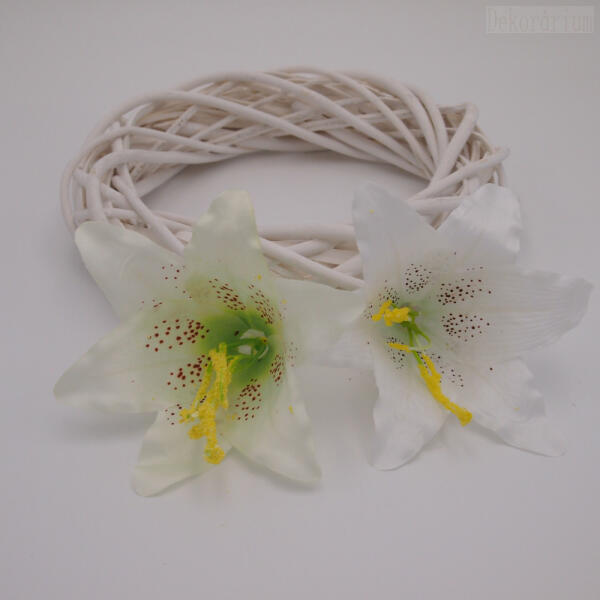 Selyem liliom fej 2 színben. A háttérben 25cm-es alap van viszonyításképpen. Az ár 1db fejre vonatkozik.
