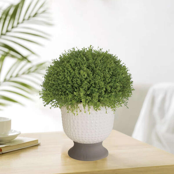 Ez egy kézzel készített, kerámia anyagból készült kaspós dísznövény. Otthonunk bármely részében kiválóan mutat dekorációként. Nagy előnye, hogy nem kell öntözni és ápolni. Méret: 20.32cm x 20.32cm x 24.77cm