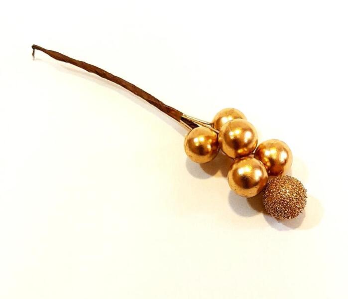 Arany színű drótos bogyócsokor, hat bogyót tartalmaz. Dekor koszorúk, téli-karácsonyi kompozíciók, lakás dekorációk tökéletes kiegészítői.