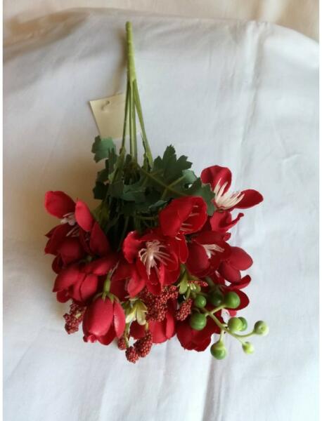 Bordó (sötét piros) színű szellőrózsa csokor, műnövény. Hossza kb. 30 cm. Lakások dekorálására, asztali kiegészítőnek, esküvői, ballagási, születésnapi, keresztelői és egyéb dekorációkhoz.