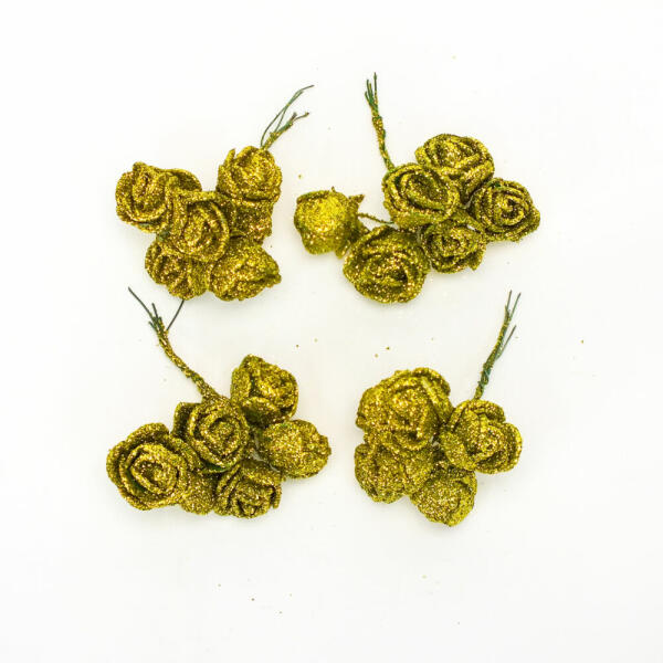 4x6 darabos csillámos rózsafej csokor. Tökéletes díszítő karácsonyi dekorációkhoz, egyedi készítményekhez és kreatív alkotásokhoz. Vékony fém szára lehetővé teszi a könnyű felhasználást. Teljes méret: 8cm, virágfej méret: 2cm