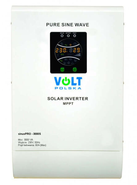 Termék részletekVOLT Polska 3000S – a VOLT Polska szolár inverter-sorozatának 3000 VA változata. Szünetmentes tápegység napelemes energiarendszerekhez. A napelemek 48 V egyenáramát 230 V hálózati váltóárammá alakítja. A szolár inverter funkció mellett szünetmentes tápegységként is kiválóan alkalmazható, jellemzően pl. háztartási keringető szivattyúkhoz. A VOLT Polska terméke a nape